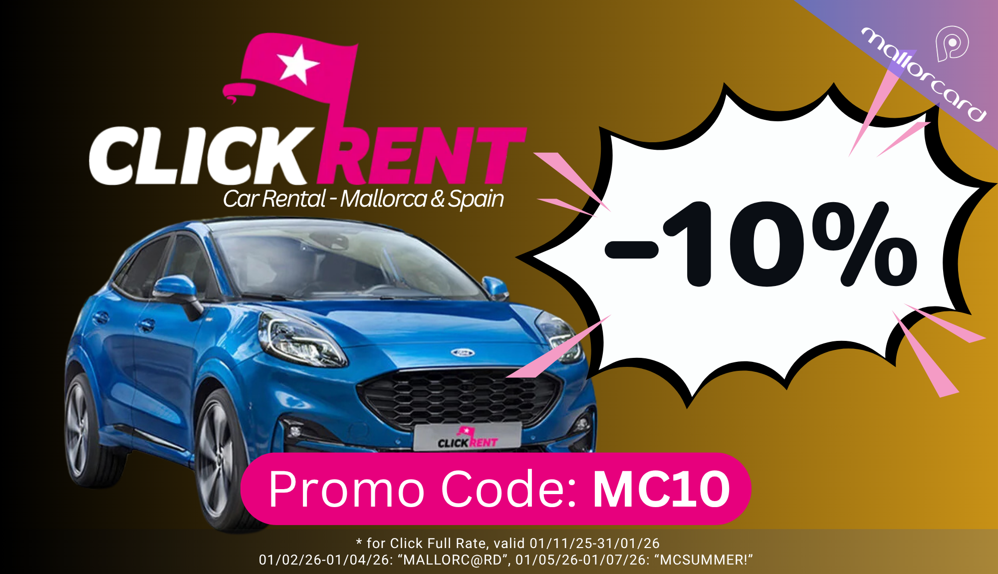 Great news for Mallorcard users! Enjoy 10% off with MC10 this winter (01/11/25–31/01/26), then keep saving through spring with MALLORC@RD (01/02/26–01/04/26) and summer with MCSUMMER! (01/05/26–01/07/26). Wherever you drive in Mallorca, Ibiza or Menorca – your discount goes with you!
