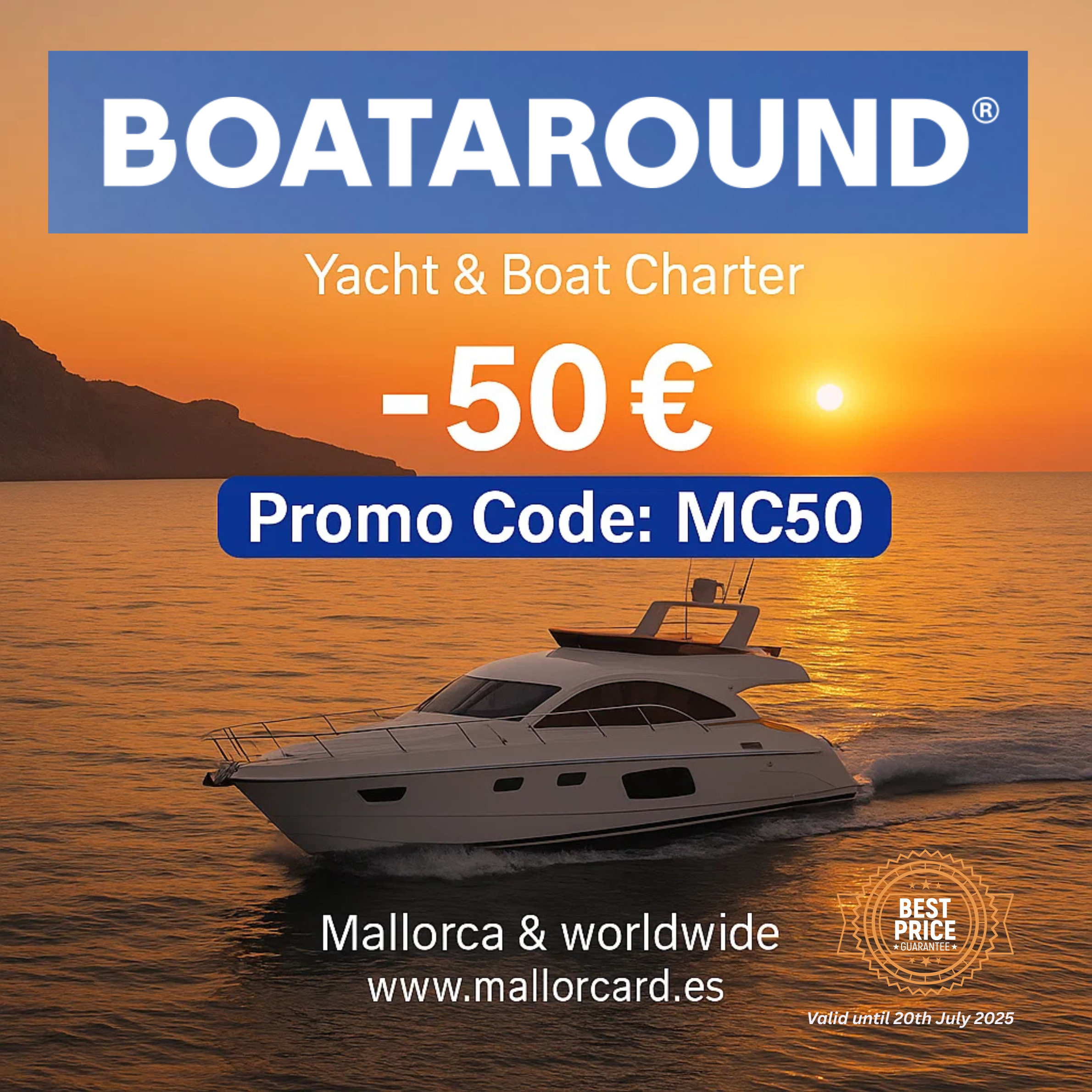 🚤 Exclusive Offer [extended until the beginning of November]: Enjoy 50 Euro off your yacht or boat rental at Boataround using Promo Code MC50 at checkout! Boataround offers a Best Price Guarantee, meaning if you find a cheaper offer elsewhere, Boataround will beat that price. Plus, with Mallorcard’s Boataround promo code MC50, you’ll receive an additional 50 Euro discount, ensuring the best possible value for your Mallorca yacht charter.