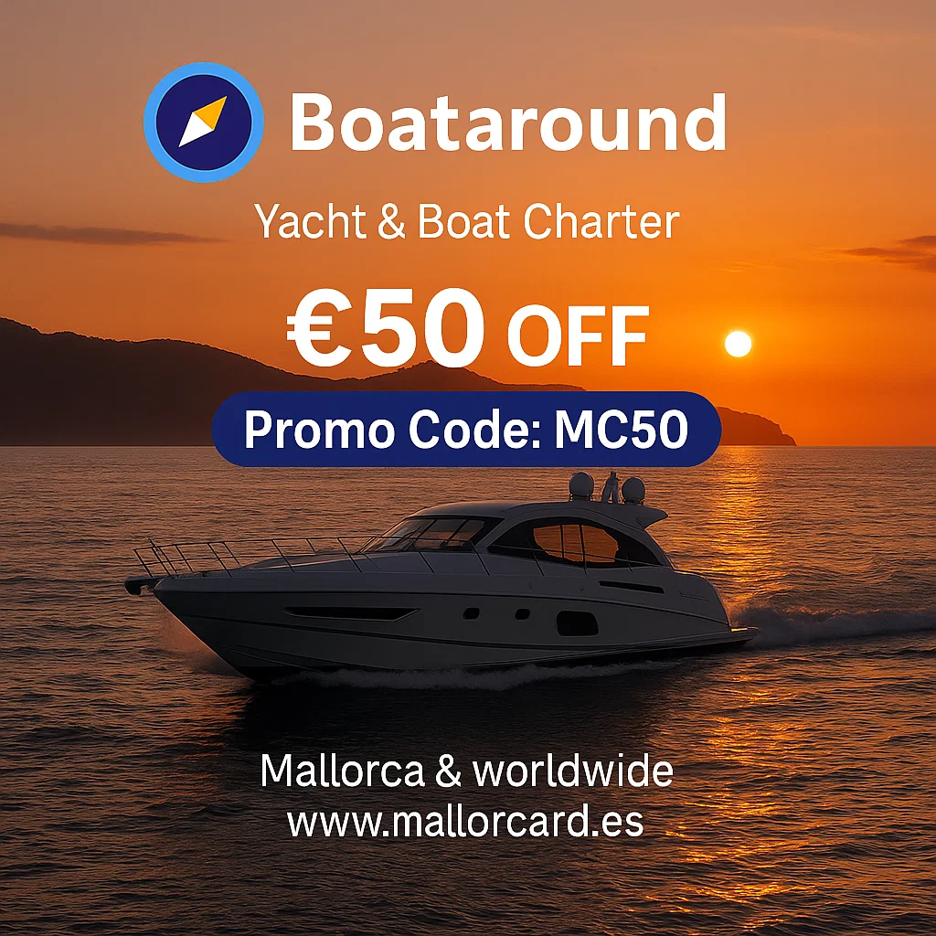 🚤 Exclusive Offer [extended until the beginning of November]: Enjoy 50 Euro off your yacht or boat rental at Boataround using Promo Code MC50 at checkout! Boataround offers a Best Price Guarantee, meaning if you find a cheaper offer elsewhere, Boataround will beat that price. Plus, with Mallorcard’s Boataround promo code MC50, you’ll receive an additional 50 Euro discount, ensuring the best possible value for your Mallorca yacht charter.