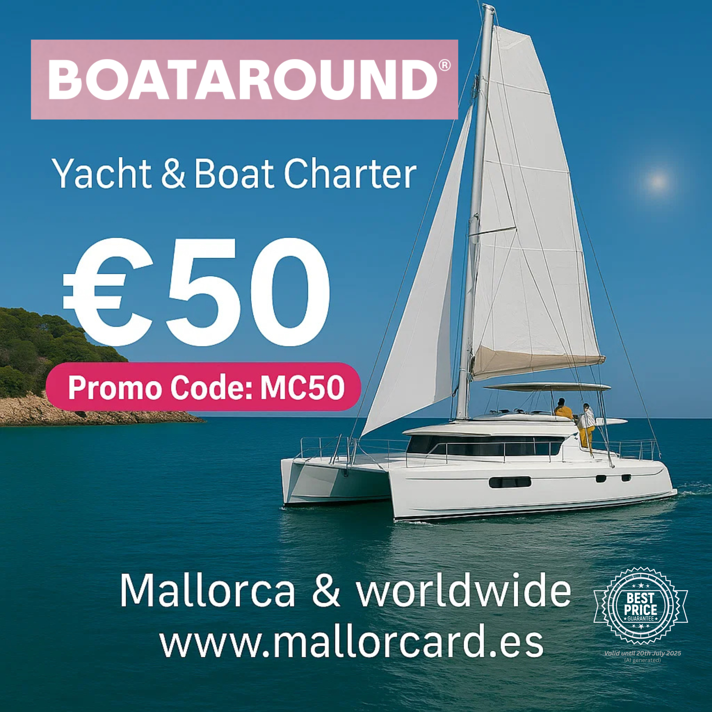🚤 Exclusive Offer: Enjoy 50 Euro off your yacht or boat rental at Boataround using Promo Code MC50 at checkout! Boataround offers a Best Price Guarantee, meaning if you find a cheaper offer elsewhere, Boataround will beat that price. Plus, with Mallorcard’s Boataround promo code MC50, you’ll receive an additional 50 Euro discount, ensuring the best possible value for your Mallorca yacht charter.